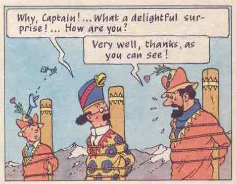 I am aware that a further connection to Tintin may appear false, but it strikes me as too similar to be completely ignored. C3PO, especially in Return of the Jedi seems to recall Professor Calculus from the Tintin comic strips. Calculus, like C3PO, is incredibly intelligent and additionally a little dotty and clumsy. Both characters have a similar figure – slim build, tall – and, in both Return of the Jedi and Herge’s Prisoners of the Sun, both characters are mistaken for a God to be worshipped within a leafy, rainforest-like context: South America in Prisoners of the Sun, Endor in Return of the Jedi. It strikes me as more than possible that, as Spielberg – and Lucas – prepared Indiana Jones and the Temple of Doom, the reference to Tintin following Raiders of the Lost Ark, assured both filmmakers read the comic books. Inevitably, ideas from the books – Tintin in Tibet in The Empire Strikes Back (assuming the comics were read by Lucas prior to production on Raiders) and Prisoners of the Sun in Return of the Jedi – managed to creep into the script choices.