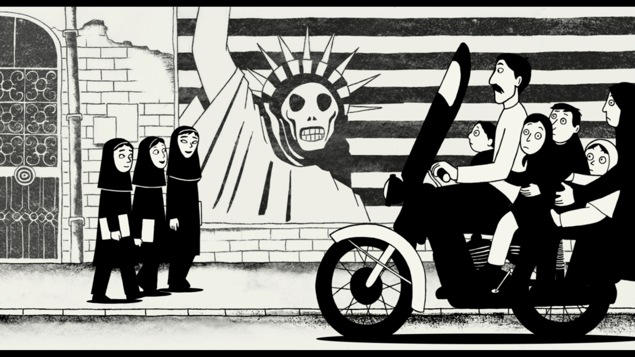 Marjane Satrapi is the woman waiting at the airport. In colour, she awaits a flight at Paris-Orly to go home to Iran. Her mind wanders back to monochrome-memories of Tehran and the family she misses so much. Her childhood is a mix of protests and inspirational talks with her uncle, Anoush (combined with a love of Bruce Lee and, in time, Iron Maiden). We see the changes in her world as Islamic Fundamentalists succeed in gaining 99% of the vote, and force strict expectations on the populace. This includes all women wearing headscarves and a no-tolerance attitude towards alcohol. Marj’s middle-class parents, Tadji and Ebi, seek a better life and send her to Austria for schooling. She meets punk-fan friends and falls in, and out, of love, before returning to Tehran and experiencing the regime as an adult, whereby Art classes are conducted with Botticelli’s Birth of Venus censored and a life-model covered from head-to-toe, leaving only the head poking out. We wonder whether Marj will stay. And how this all leads back to her colourful days in a Parisian airport.