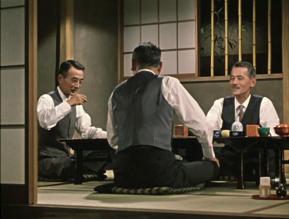 An Autumn Afternoon tells the story of Hirayama (Chishu Ryu), an older man, who has three children. His eldest son, Koichi, is married and lives away from home, while his daughter Michiko and college-son Kazuo remain at home. He works within a factory and meets with his friends Kawai and Horie over sake and . The three friends spend a night with a former teacher, referred to as ‘The Gourd’, who lives alone with his daughter. ‘The Gourd’ works in a noodle shop, his daughter is older now and will clearly not marry as she has dedicated her life to look after her father. Kawai tells Hirayama that this could be him and his daughter. This becomes the drive of the story as Hirayama has to release his daughter from the boundaries of home, and marry into another family – as Hirayama will have to learn how to look after himself.