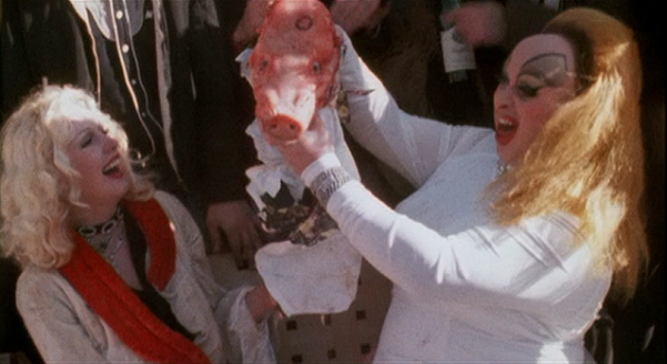 But Ebert was on to something when he struggled to rate the film. Released in the 1970’s, the concept of degrading and humiliating acts in order to garner fame seems ahead of its time. When we see the great monolith of fame in the modern world, as ‘celebrities’ eat insects on I’m a Celebrity… and revolting shock-stunts are the selling point of Jackass, the central pull to Pink Flamingos is surely ground zero. Despite this, Pink Flamingos still seems to out-gross both television shows and is funnier too. In a packed cinema, the audience was hooting and hollering to such an extent that I couldn’t help but be swept along. Divine’s forced laughter after snubbing a hitchhiker as she drives down the road is so strange, that it’s infectious. My hand raised to my face in horror as, what is initially a bony-back, becomes the open-and-close of a rectum. I’m disgusted and I’m dumbstruck: can an ass do that? Even the egg-munching of Mama, in her stained bra and pants makes you gag: you imagine the whiff of those smelly, cold eggs. It’s deeply uncomfortable and unlike anything you’ve ever seen.